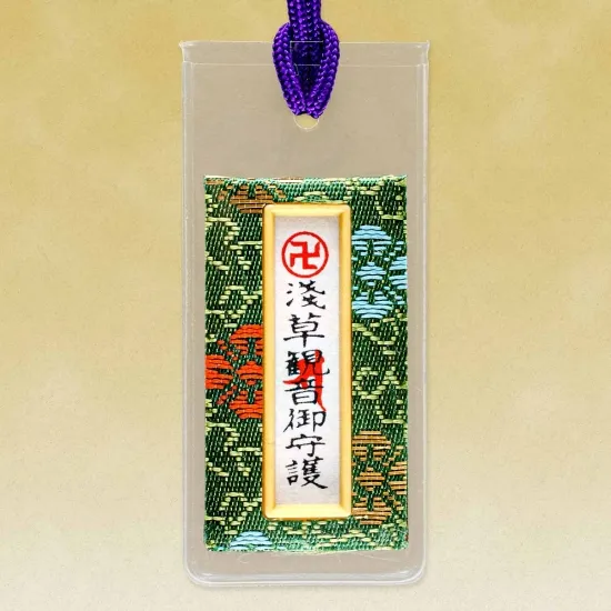 This amulet features a paper talisman beautifully decorated with embroidery that reads “Asakusa Kannon Go-mamori.” To ensure its longevity and protection, the charm is encased in a clear vinyl pouch. This protective cover prevents damage when you carry it in your wallet, bag, or purse. Measuring a compact 6.5 cm in length and 3 cm in width, it is one of the smallest charms available from Sensoji Temple. You can choose between two elegant embroidery colors: vibrant vermilion (red-orange) or serene green, to match your preference.